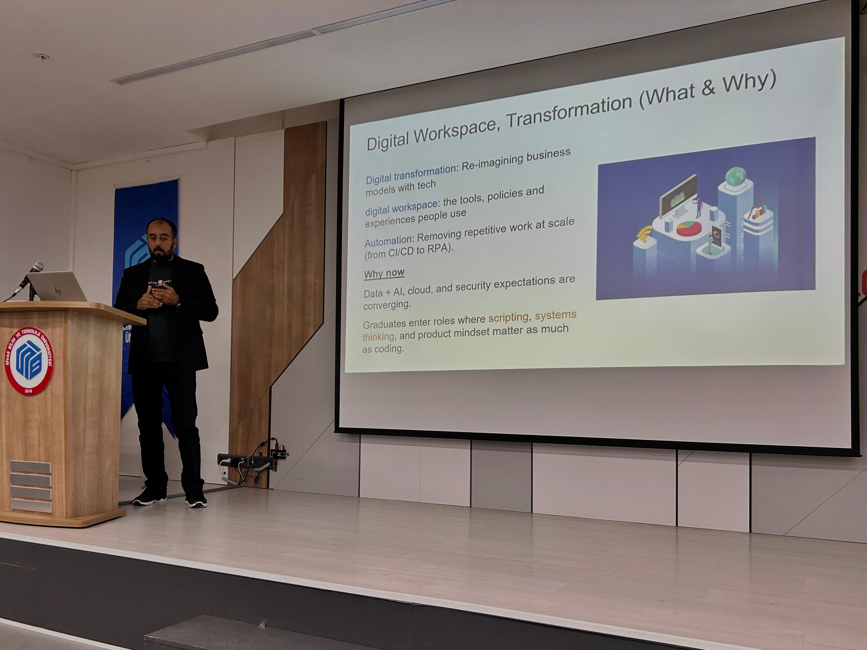 Sivas Bilim ve Teknoloji Üniversitesi’nde, dijital dönüşüm sürecinde modern çalışma ortamları ve otomasyonun rolünün ele alındığı “Modern Workspaces and Automation” başlıklı etkinlik düzenlendi. Telenor’da Senior Manager ve DevOps Tech Lead olarak görev yapan Mubashir Javaid’in konuşmacı olarak katıldığı etkinlikte, DevOps yaklaşımları, otomasyon sistemleri ve dijital iş süreçlerinin günümüz kurumlarına sağladığı avantajlar hakkında bilgiler paylaşıldı. SBTÜ Bilgisayar Mühendisliği Bölümü ile Yapay Zekâ ve Açık Kaynak Topluluğu ortaklığında düzenlenen etkinliğe öğrencilerin yanı sıra Bilgisayar Mühendisliği Bölümü akademik personeli de katıldı.
